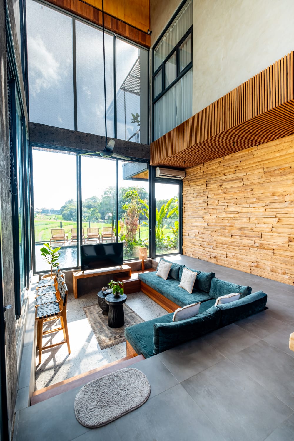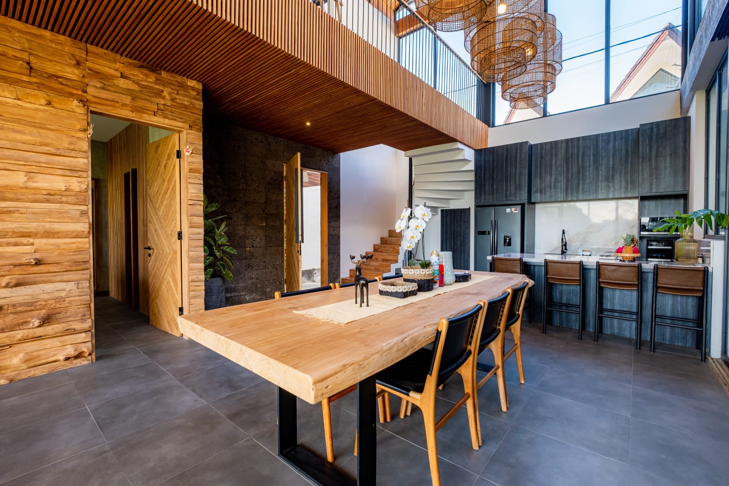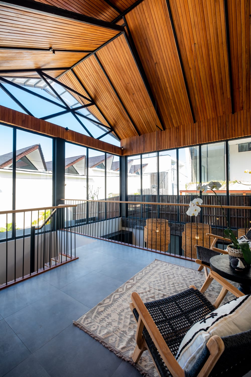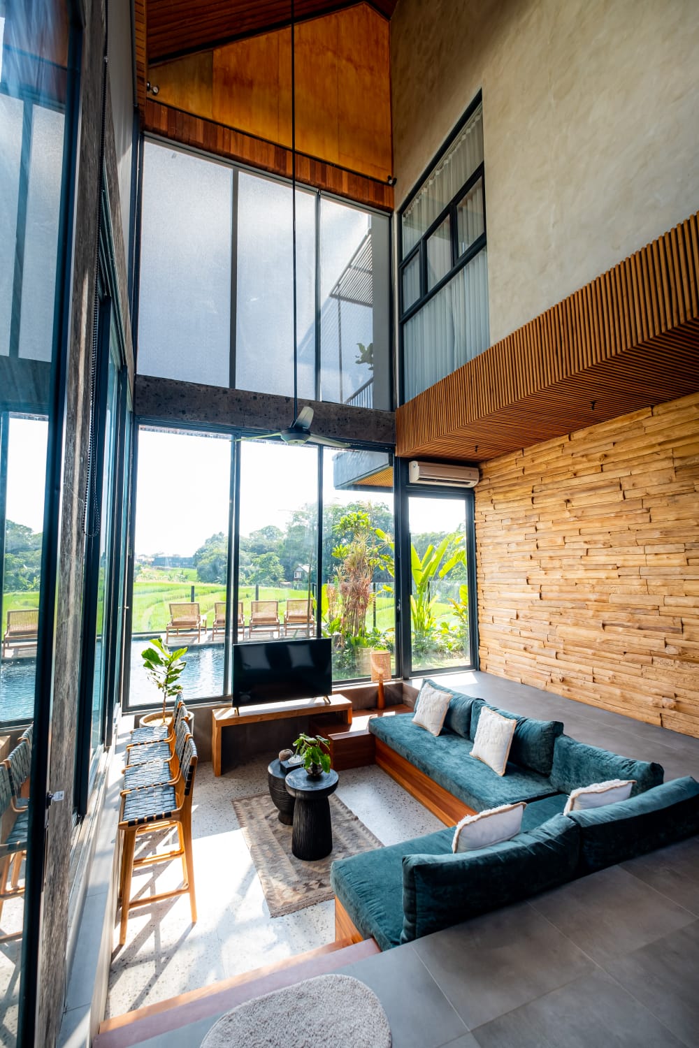 * Sophisticated Interior: Features a spacious enclosed living area with extra-high ceilings, creating a grand, airy atmosphere that keeps the tropical heat at bay.