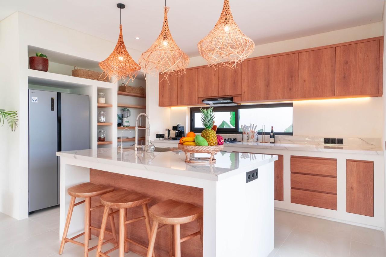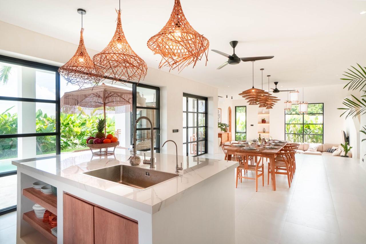 * Chef’s Hub: Open-concept kitchen with a large terrazzo island, 8-seater dining table, and minimalist rattan accents.